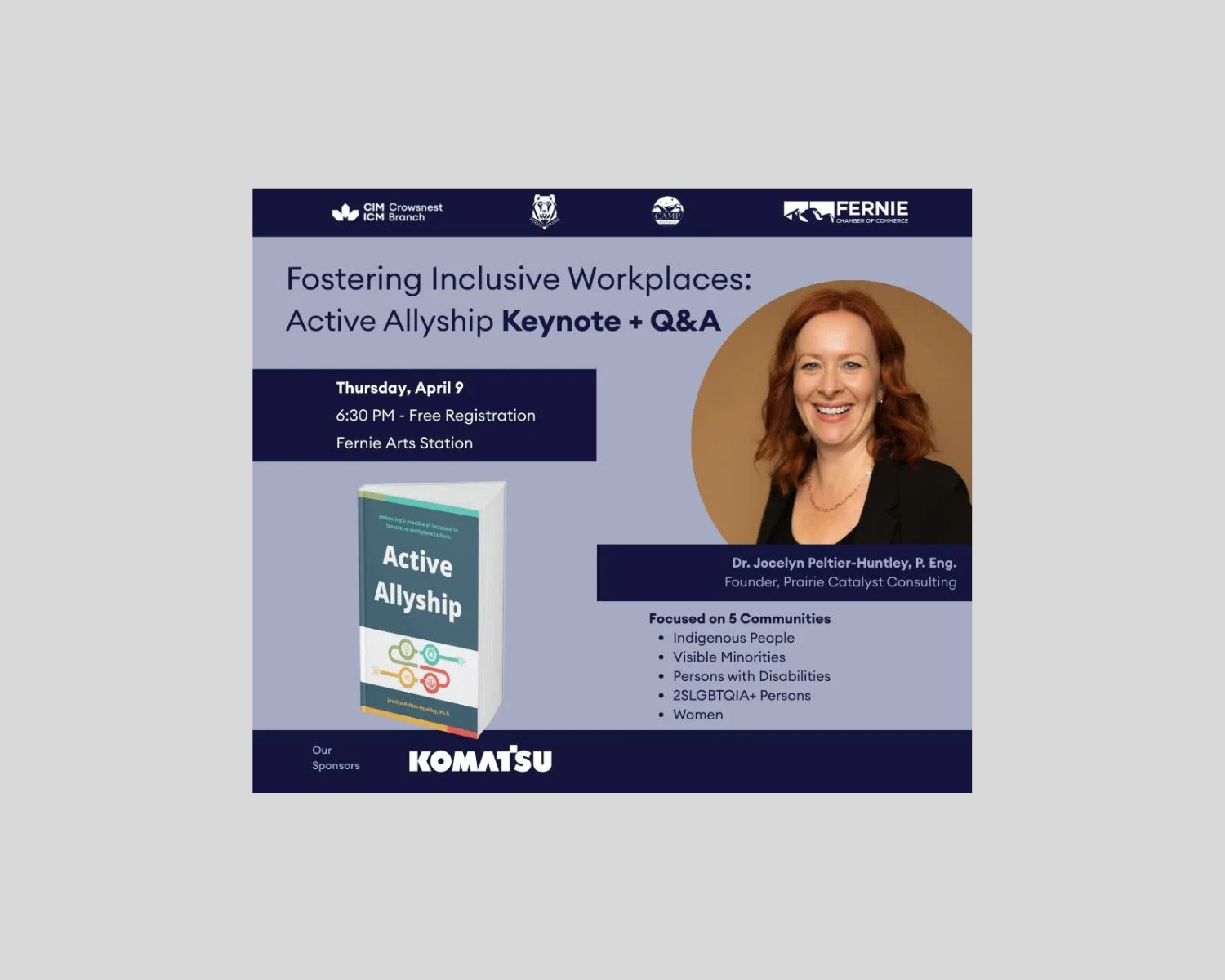 On April 9, Jocelyn will be in Fernie, BC, for Fostering Inclusive Workplaces: Active Allyship – Keynote + Q&A, co-hosted by the Canadian Institute of Mining Crowsnest Branch, the Fernie Chamber of Commerce, Fernie Pride Society, and CAMP Mental Health. She’ll share practical, evidence-based insights from her book Active Allyship and explore how everyday actions can help build more inclusive workplace cultures.